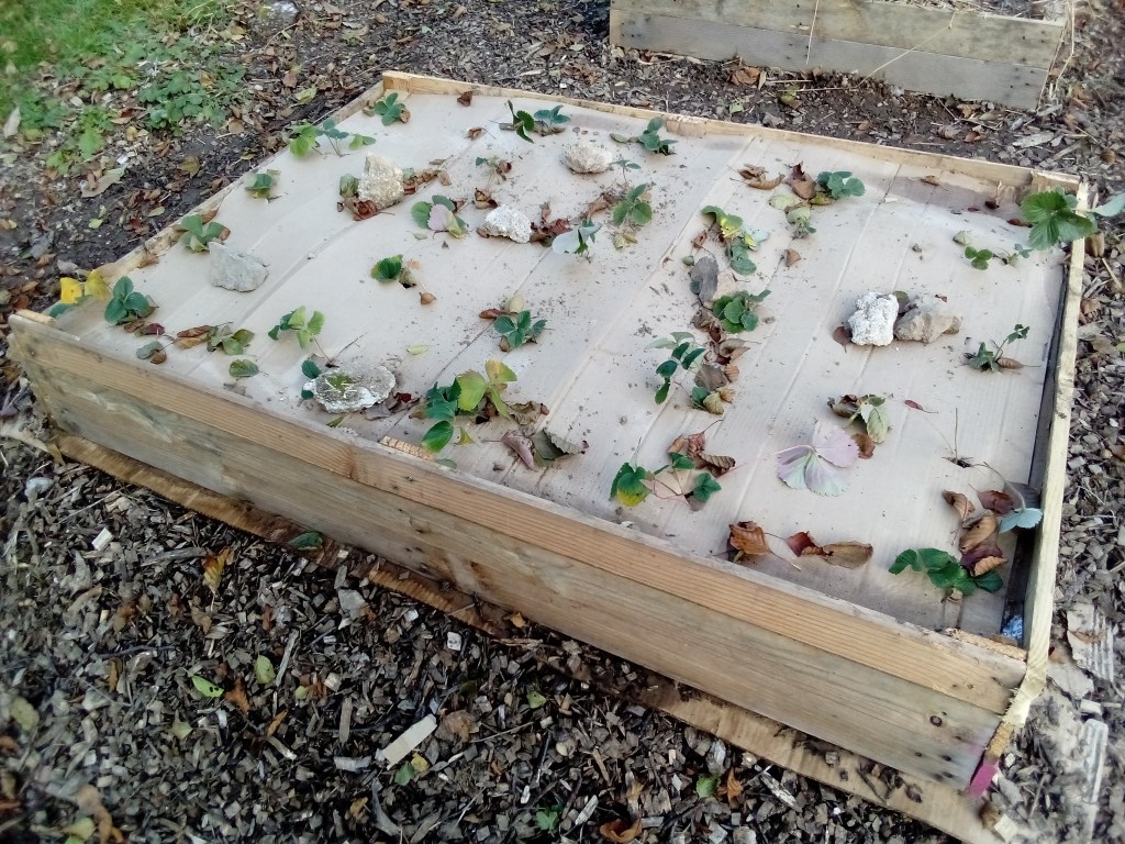 To try and spread, or even prolong the strawberry season I decided this autumn to pull up all the plants and start again. I will retain the bed within the poly-tunnel, which has always provided the earliest fruit, as well as a bed along the east side of the polytunnel which had become very overgrown and unproductive. But in the ‘back’ garden I decided to create new 1.2 x 1.8m raised beds (my raised beds are quite small as they are usually made from dismantled pallet wood). Each of these beds was filled with home-produced compost and topped with cardboard through which the runners are planted. I have lost track of which varieties I have; my first 6 plants went in nearly 20 years ago and I have added various finds and donations.